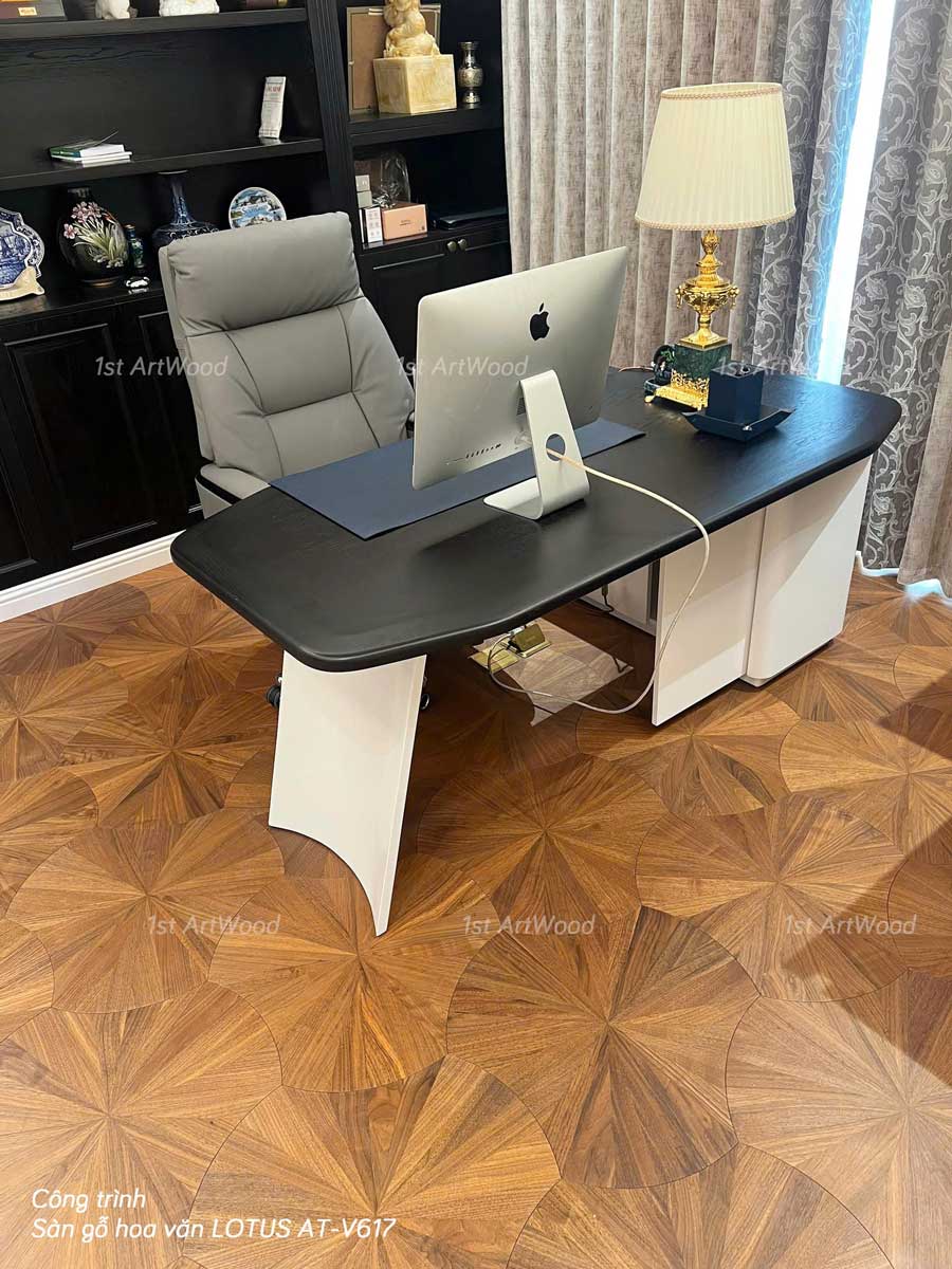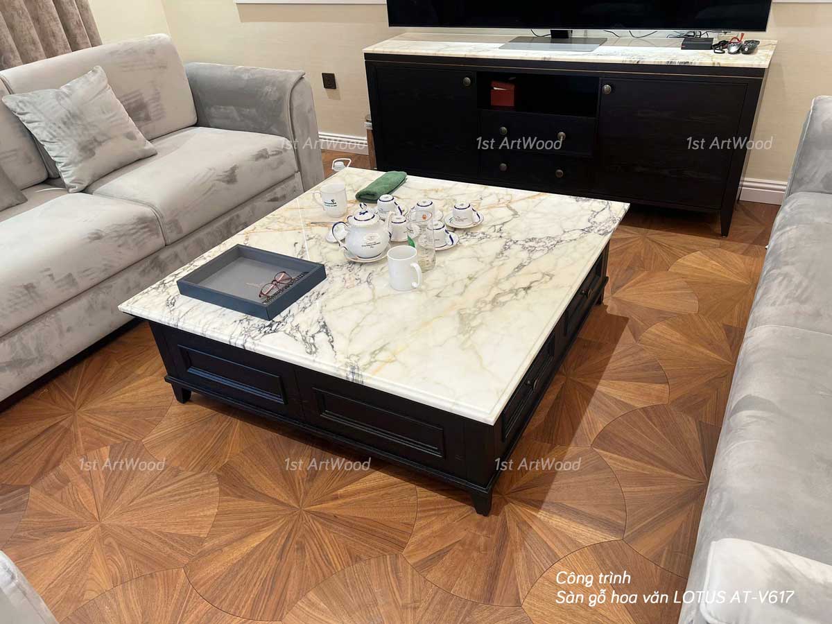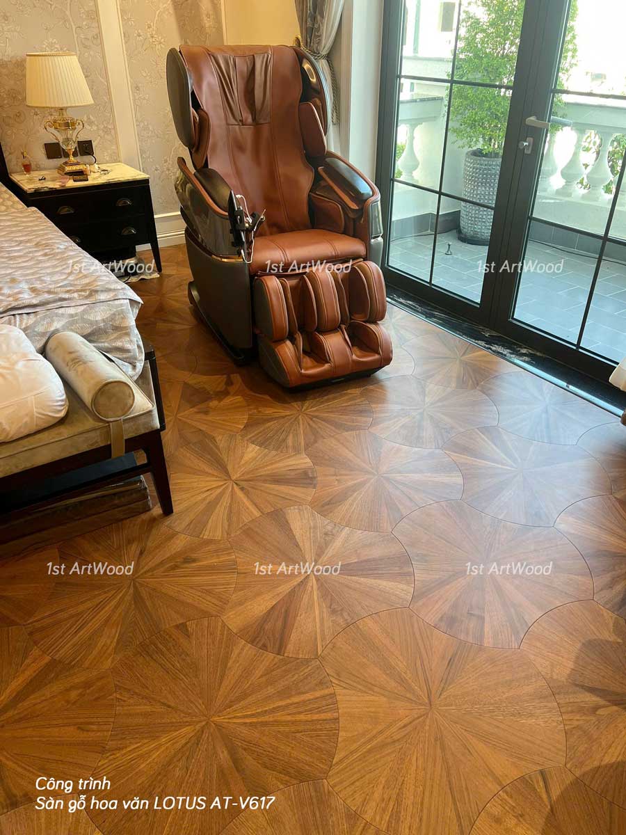 - Sản phẩm: Sàn gỗ hoa văn LOTUS AT-V617 – họa tiết cánh sen, tông màu óc chó