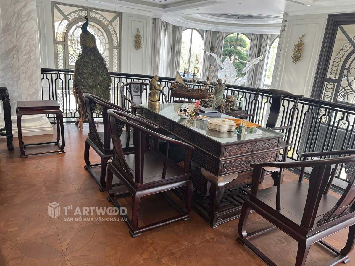 Không gian nội thất lâu đài Từ Sơn với hệ sàn gỗ hoa văn cao cấp – thi công bởi 1st ArtWood.