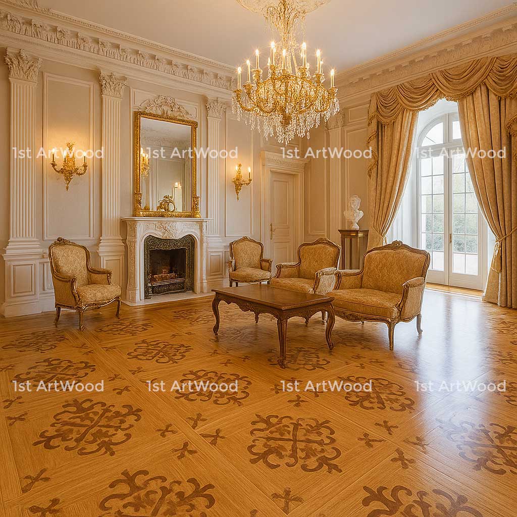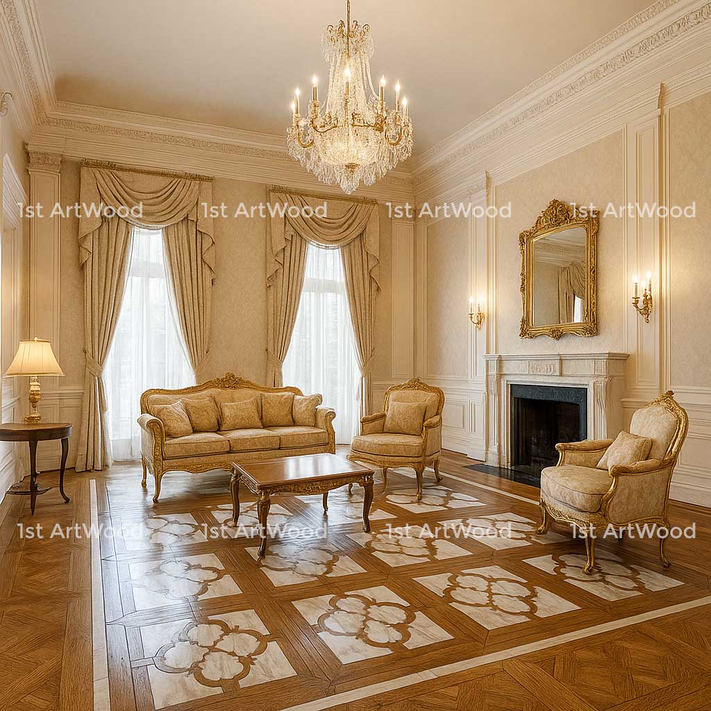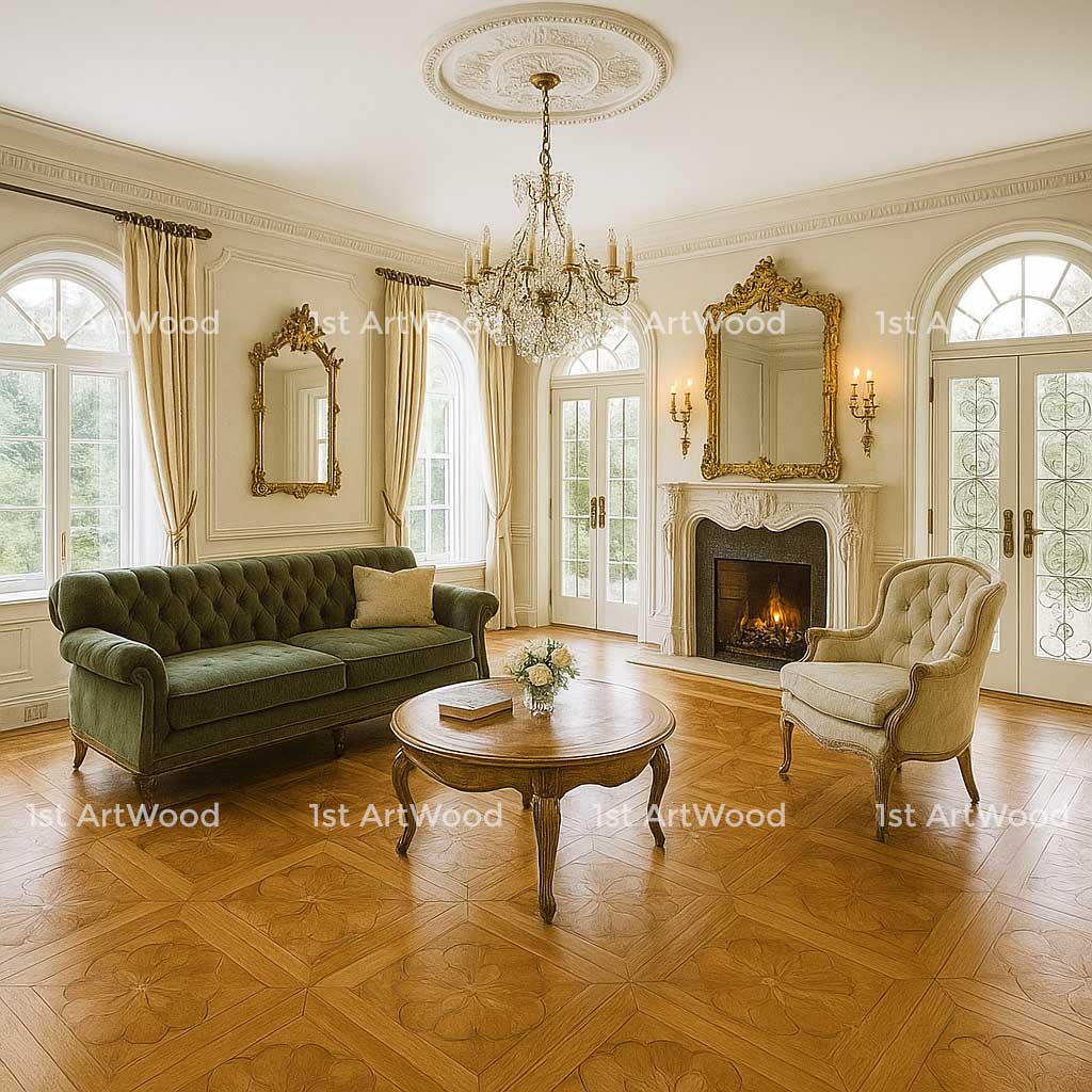 - Sàn gỗ hoa văn (gỗ kỹ thuật – engineered parquet) – kế thừa tinh thần nghệ thuật thủ công từ châu Âu.